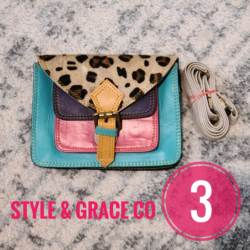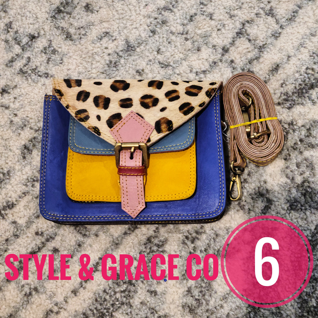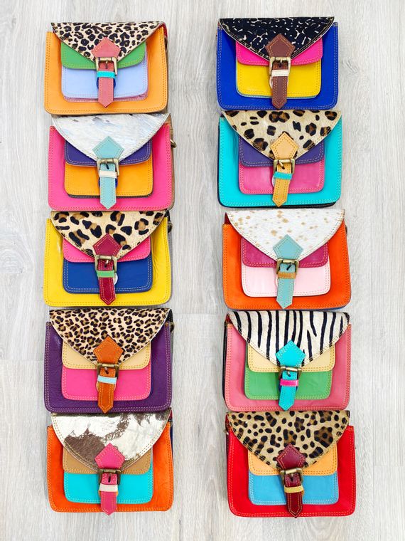 Genuine leather bag featuring bright colors and hair on hide detailing. Handmade in India. Features higher quality double stitching detail.