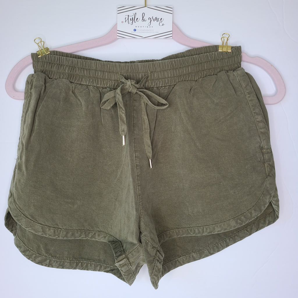 Who doesn't love a comfortable pair of shorts?! These shorts have an elastic, drawstring waist and come in a soft Olive color. Pair them with your favorite graphic tee and you're set!