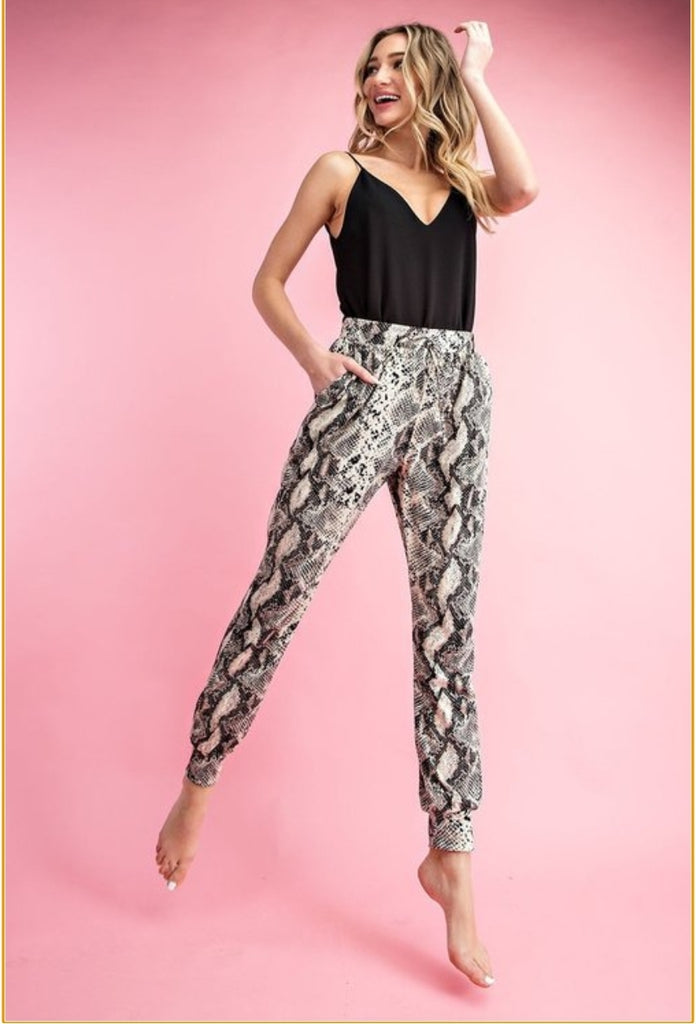 Simple and timeless. Every closest needs a good camisole tank in it. Our Just a Flirt tank features a sexy v-neck with a racer-back-like back. It has very small, woven like texture with a lining, so you can't see thru it. It also has adjustable straps. Wear it like it is or tucked. It goes great with our Snake Joggers.